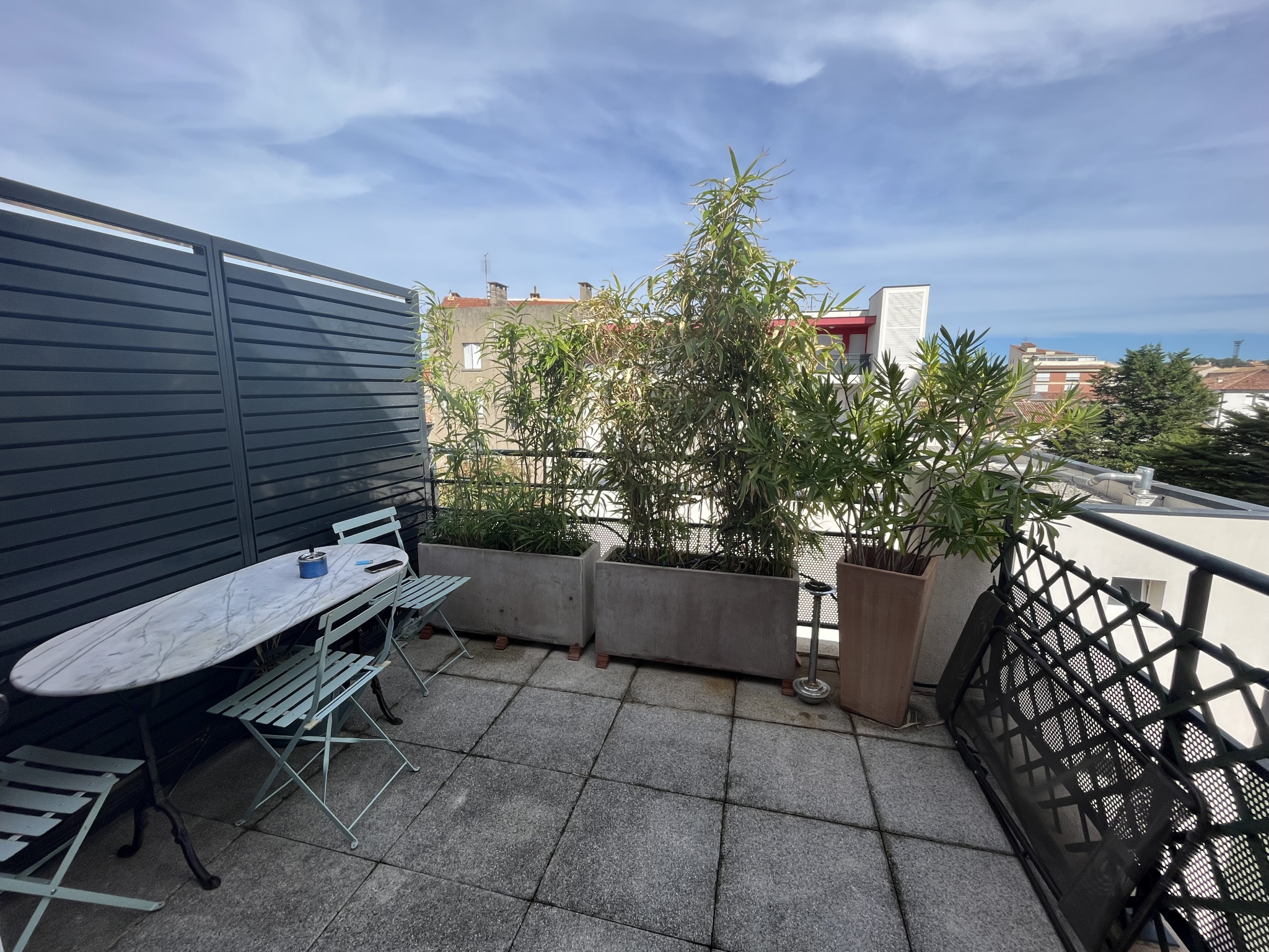 NIMES-NOTRE DAME. Dans résidence récente, au 4ème et dernier étage, beau P2 de 41 m² avec Terrasse de 7.44 m² , Ascenseur et Garage. Cuisine équipée ouverte sur séjour, 1 chambre avec placards, salle d'eau , wc et emplacement lave-linge. Menuiseries double vitrage, visiophone. disponible 1er avril 2026